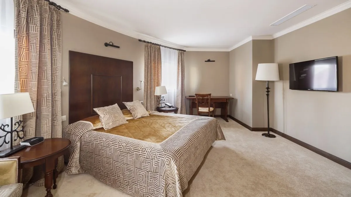 Просторный комфортабельный номер люкс площадью от 52,4 до 62,8 м2 с двумя комнатами (спальней и гостиной) и просторной гардеробной или шкафом. Интерьер люкса отличается сдержанностью и элегантностью, а цветовая гамма выдержана в благородных бежево-золотистых тонах. Одновременно в номере этой категории может проживать два человека, дополнительное место оплачивается отдельно.